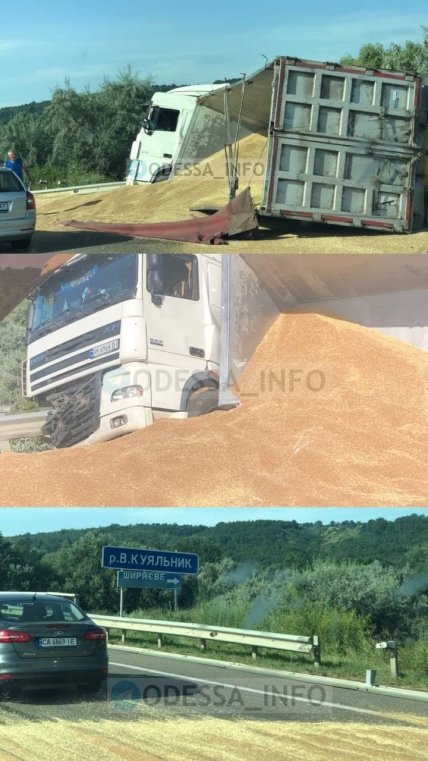 В пятницу 16 июля на трассе Киев-Одесса перевернулась фура с зерном. Об этом сообщает Telegram канал Одесса INFO