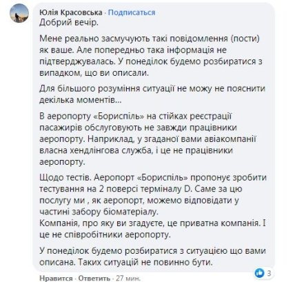На пост отреагировала заместитель начальника службы по вопросам взаимодействия со СМИ и коммуникаций с общественностью "Борисполя" Юлия Красовская, указав, что у компании SkyUp есть собственная хэндлинговая служба, поэтому, скорее всего, его знакомого обслуживали не сотрудники аэропорта.