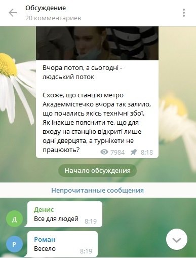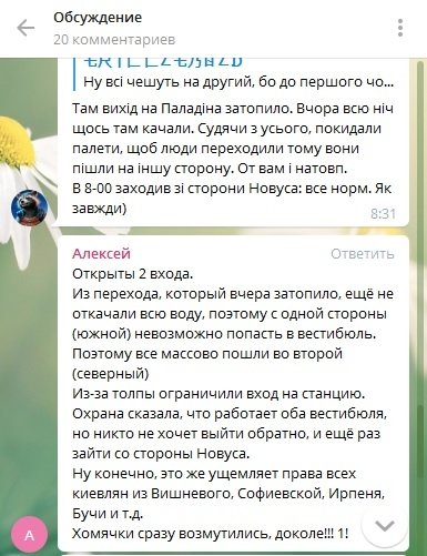 Его слова подтверждает еще один комментатор: "Из перехода, который вчера затопило, ещё не откачали всю воду, поэтому с одной стороны (южной) невозможно попасть в вестибюль. Поэтому все массово пошли во второй (северный)".