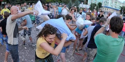 В Луганске впервые состоялся массовый бой подушками, участвовать в котором приглашали всех желающих.