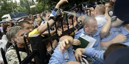 Позже предприниматели с рынка "Шлях" вышли к Святошинскому райотделу милиции, чтобы разыскать милиционера, избившего активистку на рынке, и сломали забор возле Святошинского райотдела милиции.