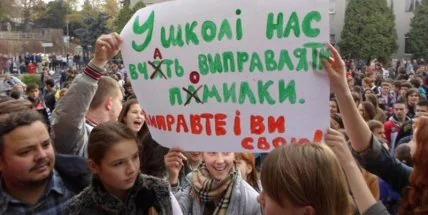Сегодня в городе Ужгород школьники с родителями устроили акцию протеста против отмены осенних каникул. В ходе акции здание мэрии забросали яйцами, туалетной бумагой и конфетами. Всего в акции приняло участие около 2 тыс. человек. По словам протестующих большинство из них получили приглашение на акцию накануне через СМС-сообщение.