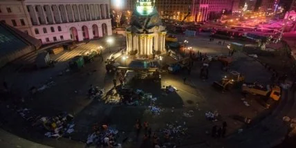 В настоящее время на Майдане Незалежности, на противоположной стороне от монумента Независимости, проходит небольшой митинг при участии приблизительного 70 человек. Также на гранитных плитах Майдана еще можно увидеть несмытую кровь пострадавших от ночного штурма участников Евромайдана.