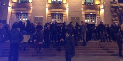 Однако центральный вход открыт, куда постоянно заходят и выходят люди. На втором этаже в Колонном зале активисты устроили штаб и установили столы с едой. Люди или сидят за столами для заседаний, или просто сели на пол. Некоторые просто спят на полу.