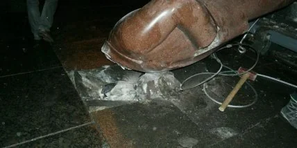 По словам корреспондента, около тридцати активистов продолжают разрушать остатки памятника, они передают друг другу молот и скандируют: "Банду геть!".