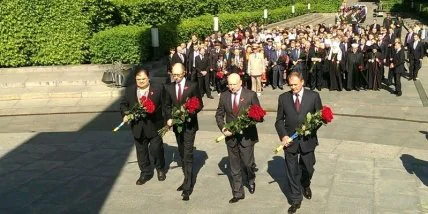 Чиновники возложили цветы к Мемориалу Вечной Славы в Парке Славы в Киеве и почтили память погибших минутой молчания. Арсений Яценюк пообщался с ветеранами войны, поздравил их с Днем победы и пожелал им здоровья.