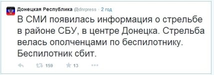 "В СМИ появилась информация о стрельбе в районе СБУ, в центре Донецка. Стрельба велась ополченцами по беспилотнику. Беспилотник сбит", - говорится в сообщении.