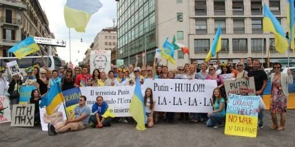 "После этого, на итальянском языке были изложены хронологию последних событий в Украине, демонстрировались сценки с палачом-Путиным и Украины, которую он пытается захватить. Собравшиеся скандировали лозунги "Путин! Руки прочь от Украины", "Путин - агрессор и убийца!", "Украина свободна!", - отметили организаторы.