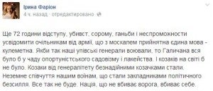 "Еще 72 часа отступления, убийств, стыда, позора и несостоятельности осознать руководителям от армии, что с москалем приемлем один язык - пулеметный. Если бы так наши генералы УПА воевали, то Галличина вся была бы в чаду оппортунистского садовизма и лакейства. И казаков на свете бы не было. Казаки от генералитета безнадежными казачками стали бы. Неземное сочувствие нашим воинам, которые стали заложником политического бессилия. Все так не будет. Нация, которая не убивает врага, убивает себя", - написала Ирина Фарион на своей странице в Fb.
