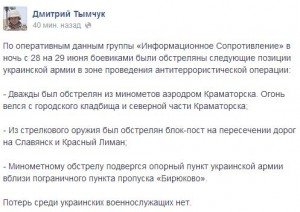 "По оперативным данным группы "Информационное Сопротивление" в ночь с 28 на 29 июня боевиками были обстреляны следующие позиции украинской армии в зоне проведения антитеррористической операции: