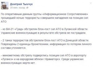- из БМ-21 "Град" обстрелян блок-пост сил АТО в Луганской области. Украинские военнослужащие в результате обстрела не пострадали.