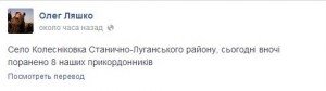 Сегодня ночью на Луганщине в районе села Колесниковка получили ранения 8 украинских пограничников, об этом сообщил на своей странице в Facebook нардеп Олег Ляшко. Отметим, что эту информацию на текущий момент пока не подтвердили ни в Госпогранслужбе, ни в СНБО.