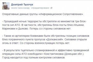 Также ничего об этом столкновении не сообщил и на своей странице Дмитрий Тымчук. Зато, координатор группы "Информационное сопротивление" рассказал, что сегодня ночью из минометов были обстреляны три украинских блок-поста. Нападению подверглись заградительные контрольно-пропускные пункты около Ильинки, Мариновки и Дьяково.