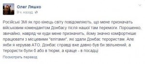 В своем сообщении Ляшко написал, что Петру Порошенко "комфортней работать с местными "элитами", которые сдали Донбасс террористам". Политик сказал, что если бы ему доверили руководство АТО, то Донбасс давно был бы свободен, а террористы сидели в тюрьме или были бы уже в могиле.