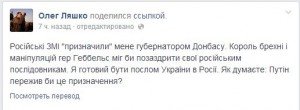 Олег Ляшко решил не соглашаться на должность губернатора Донбасса, однако народный депутат готов занять пост посла Украины в России, об этом он написал на своей странице в Facebook. "Российские СМИ "назначили" меня губернатором Донбасса... Я готов быть послом Украины в России".