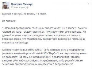 Сегодня на Луганщине был сбит самолет Воздушных Вооруженных сил Украины Ан-26, сообщил на своей странице в Facebook Дмитрий Тымчук. Координатор "Информационного сопротивления" написал, что 2 украинских летчика попали в плен к боевикам.