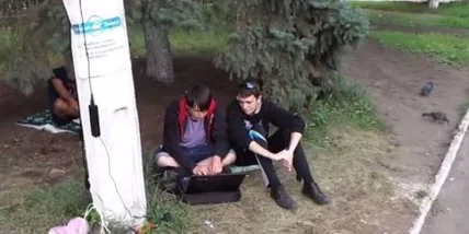 "Эти розетки уже давно здесь. Я шла сюда из деревни Черепковка, что за городом. У нас там нет света", - рассказывает женщина. У столба с розетками прямо на траве уселись молодые ребята с ноутбуками и также заряжают свои устройства.