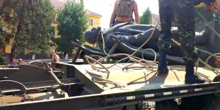 В городе Счастье (Луганская область) с постамента сняли памятник Ленину. На портале YouTube появилось видео, когда шесть человек в камуфляжах (трое - в масках) готовят памятник к транспортировке. На видео видно, что памятник уже сняли с постамента и уложили горизонтально в грузовой автомобиль. С виду памятник не повредили.