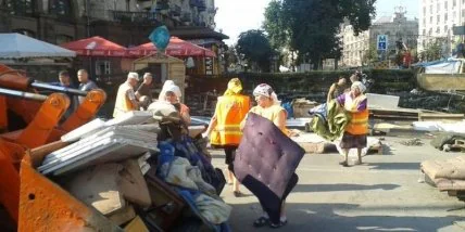 Пожар, который возник из-за поджога баррикад, со стороны улицы Михайловской на Майдане Незалежности, потушили. Киевляне с еще большим рвением стали разбирать палатки возле фонтанов.