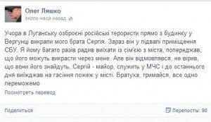 В Луганске вооруженные российские боевики из дома похитили брата народного депутата Олега Ляшко. Об этом сам политик написал в Фейсбуке. По словам народного депутата Олега Ляшко, похищение его брата Сергея произошло в Луганске. Как написал лидер "Радикальной партии", вооруженные террористы похитили его брата из дома в Вергунке.
