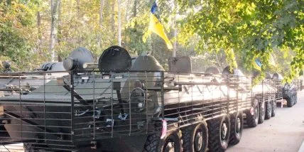 С территории одной из столичных военчастей Госпогранслужбы Украины в зону АТО для охраны государственной границы отправились 6 БТРов, 8 грузовиков и 3 микроавтобуса.