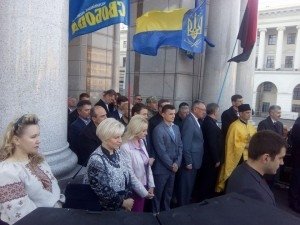 Они выстроились в колонну на пересечении ул. Институтской и Крещатик. В руках активисты держали флаги "Свободы", флаги Украины, красно-черные националистические флаги. Они скандировали "Слава Украине! Героям слава!", "ОУН-УПА – государственное признание" и требовали признать воинов УПА борцами за независимость на государственном уровне.