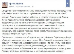 "Михаил Пореченков, прибыв в Донецк, в составе вооруженной банды, лично принял участие в обстреле подразделения украинских вооруженных сил из автоматического оружия. Эти кадры обошли телеэкраны, в полном объеме разоблачая этого гражданина России в совершении преступления на территории Украины. Согласно уголовного кодекса Украины, такое преступление наказывается лишением свободы на срок от 7 до 12 лет", - подчеркнул он.