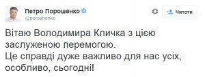"Поздравляю Владимира Кличко с этой заслуженной победой. Это действительно очень важно для нас всех, особенно, сегодня!", - сказано в сообщении П.Порошенко в его Твиттере.