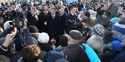 Во время возложения цветов родственники погибших майдановцев скандировали "Позор Порошенко" и "Где звания героев". После того, как Президент уехал, люди начали петь Гимн Украины.