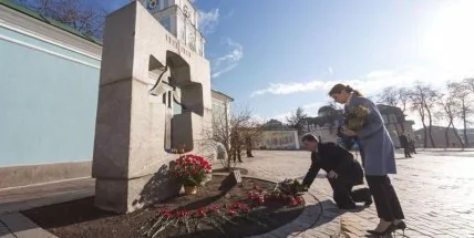 Президентская чета возложила цветы к памятному знаку жертвам Голодомора возле Михайловского собора в Киеве.