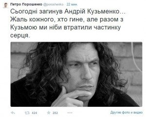 "Сегодня погиб Андрей Кузьменко... Жаль каждого, кто погибает, но вместе с Кузьмой мы будто бы потеряли частичку сердца", - написал Порошенко в Twitter, передает УНН.
