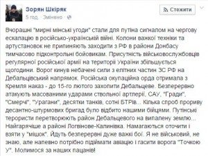 По словам Шкиряка, "вчерашние "мирные минские соглашения" стали для Путина сигналом на очередную эскалацию в российско-украинской войне".