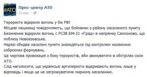 Обновлено 00:45 Боевики из района населенного пункта Безымянное открыли огонь из РСЗО БМ-21 «Град» в направлении Самсоново, что вблизи Новоазовска. Об этом сообщает пресс-центр АТО на своей странице в Facebook.
