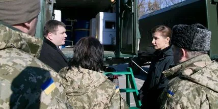 Сообщается, что жена Президента Украины Марина Порошенко посетила воинскую часть технического обеспечения ВСУ в поселке Озерное Житомирской области, где передала мобильные стиральные комплексы для военнослужащих, находящихся в зоне АТО. Передвижные комплексы были разработаны и изготовлены в этой воинской части.