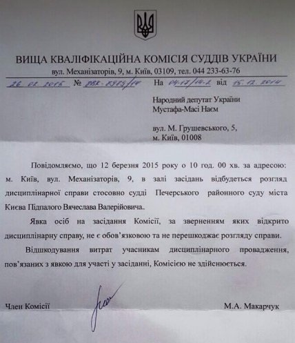 Он рассказал, что заседание Высшей квалификационной комиссии судей, на котором рассматриваться дисциплинарное производство в отношении судьи состоится завтра в 10:00 по адресу г. Киев, ул. Механизаторов, 9.