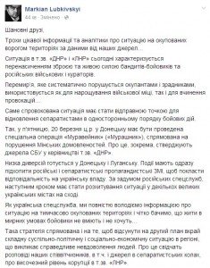 М.Лубкивский также сообщил: "Ряд диверсий готовится в Донецке и Луганске. События должны сразу подхватить российские и сепаратистские пропагандистские СМИ, чтобы возложить ответственность на украинскую власть. По замыслу российских спецслужб, следующим шагом должно стать расшатывание ситуации в нескольких крупных украинских городах на востоке".
