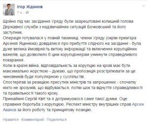 "Операция готовилась в полной тайне, члены правительства (кроме премьера Арсения Яценюка) узнали о прибытии следователя на заседании - была очень велика вероятность утечки информации и включение коррупционных рычагов, что позволило бы этим коррупционерам избежать справедливого наказания", - написал он.