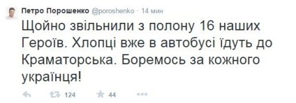 "Только что освободили из плена 16 наших Героев. Ребята уже в автобусе едут в Краматорск. Боремся за каждого украинца!", - указывается в сообщении.