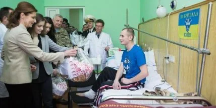 Супруга Президента Марина Порошенко во время посещения раненых пограничников в Главном военно-медицинском клиническом центре "ГВКГ", предложила привлекать школьников помогать бойцам, которые находятся на лечении.