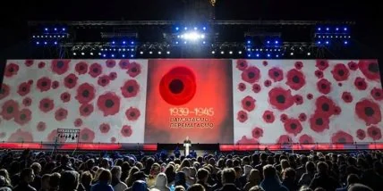 "Мы перестали бояться. 8 мая 1945. Берлин, Германия, на часах 23.00, высыхают последние капли чернил, вылетают последние пули из стволов - Третий рейх капитулировал. Нацизм побежден, черная туча, охватившая всю Европу, наконец развеялась. Начинается первая минута мира, и всех наших героев мы помним и чтим минутой молчания", - прозвучал голос со сцены.