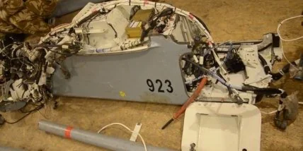 Сбитый БПЛА - марки "Форпост" производства "Уральского завода гражданской авиации" Российской Федерации. Серийный номер изделия военного назначения 923, в 2013 году сборника. Длина аппарата около 5 метров.
