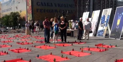 Несколько десятков активистов расстелили красные коврики и легли с цветами в руках у стелы на Майдане Независимости. Таким образом друзья и родные погибших напомнили власти о трагедии в которой погибли 49 военных.