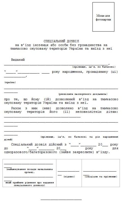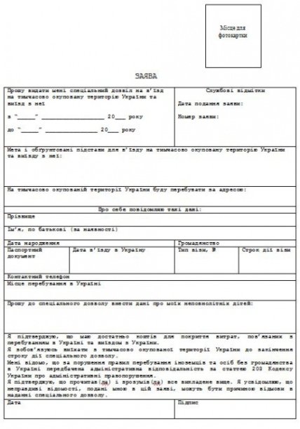 Для получения спецразрешения надо подать: заявление; паспортный документ; документ, который подтверждает пребывание в Украине на законных основаниях; копию страницы документа с личными данными с переводом на украинский; документы, подтверждающие цель въезда на оккупированную территорию; документ, подтверждающий достаточность финансового обеспечения для пребывания в Украине; три фото 3,5х4,5.