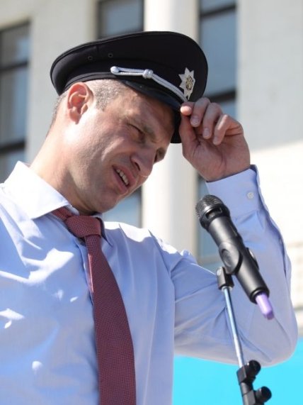 Мэр Киева Виталий Кличко получил в подарок от патрульных полицейских фуражку.