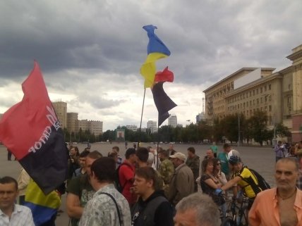 Акция в поддержку "Правого сектора" проходит и на площади Свободы в центре Харькова. В акции принимают участие не меньше ста человек. Часть из них в камуфляже и бронежилетах, без масок. Оружия не видно. В руках у активистов плакаты: "Відставка міністра Авакова", "Публічний арешт депутата Ланьо", "Злочинців зі влади - на нари", "Олександр "Білий" Музичко - не забудем і помстимось".