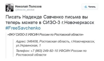 А его коллега Николай Полозов, также навещавший подопечную, указал почтовый адрес, по которому в настоящее время можно писать письма Надежде Савченко.