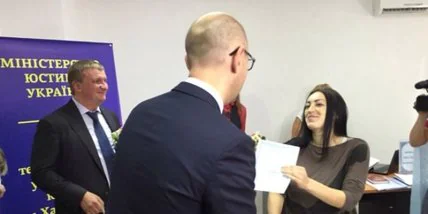 Премьер-министр Украины Арсений Яценюк и министр юстиции Павел Петренко в Харькове презентовали новый сервис Минюста, который позволяет получить свидетельство о рождении ребенка непосредственно в роддоме.