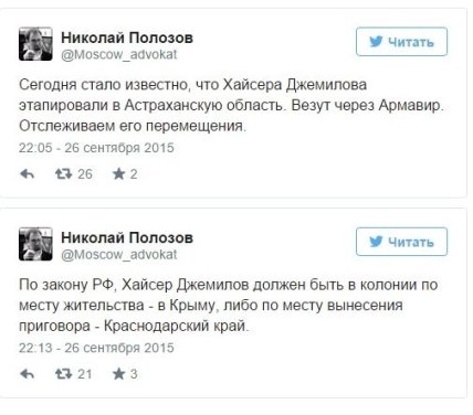 "Хайсера Джемилова этапировали в Астраханскую область. Везут через Армавир. Отслеживаем его перемещения", - написал он.