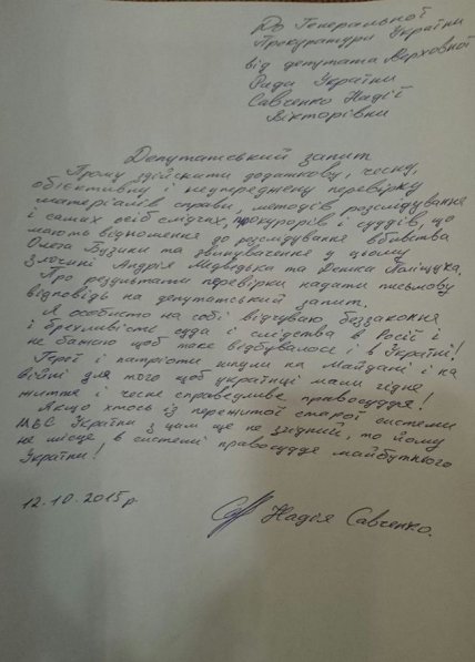 Народный депутат Надежда Савченко, которую незаконно удерживают в российской тюрьме, просит Генпрокуратуру проверить судей и следователей по делу об убийстве Олеся Бузины. Об этом говорится в запросе Савченко на имя главы ГПУ Виктора Шокина, который обнародовал в Фейсбуке нардеп от "Батьківщини" Игорь Луценко.