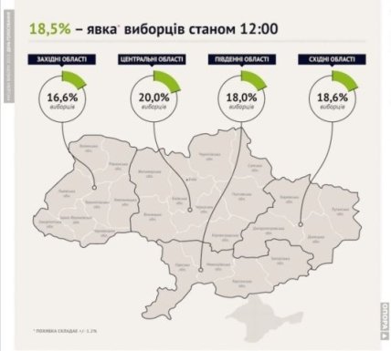 Как сообщает пресс-служба гражданской сети ОПОРА, в центральных областях уже проголосовал каждый пятый житель. Так, в центральных областях (Винницкая, Житомирская, Черкасская, Киевская, Кировоградская, Черниговская, Сумская области и Киев) явка избирателей — 20%, на Западе страны (Львовская, Ивано-Франковская, Закарпатская, Тернопольская, Хмельницкая, Ровенская, Волынская, Черновицкая области) — 16,6%.